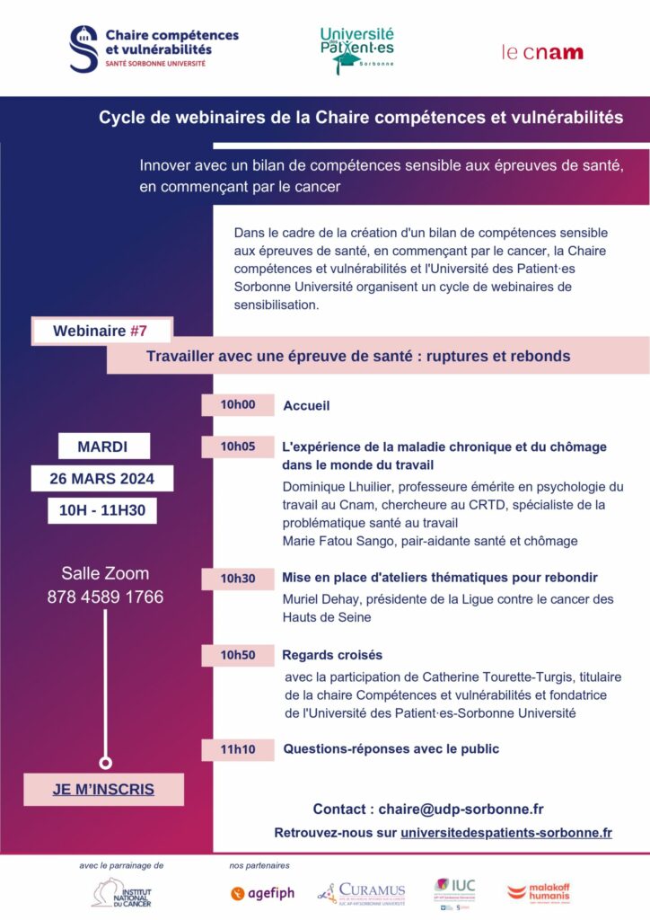 Dans le cadre de la création d’un bilan de compétences sensible aux épreuves de santé, en commençant par le cancer, la Chaire compétences et vulnérabilités et l’Université des Patient.es Sorbonne Université organise un cycle de webinaires de sensibilisation.