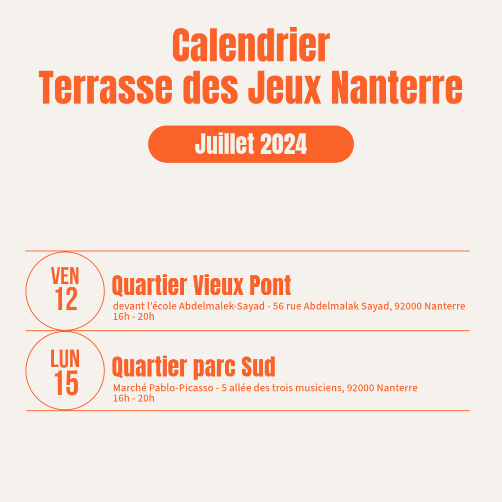 La prévention aux terrasses des jeux Évènement de Nanterre 🗓️ juillet 2024 Les rendez-vous Prévention de l’étéTerrasses des Jeux de Nanterre Cet été la ville de Nanterre organise les Terrasses des Jeux durant les mois de juillet et d’août.Une riche programmation d’animations sous le signe du sport en écho au Jeux Olympiques, est prévue dans les différents […]