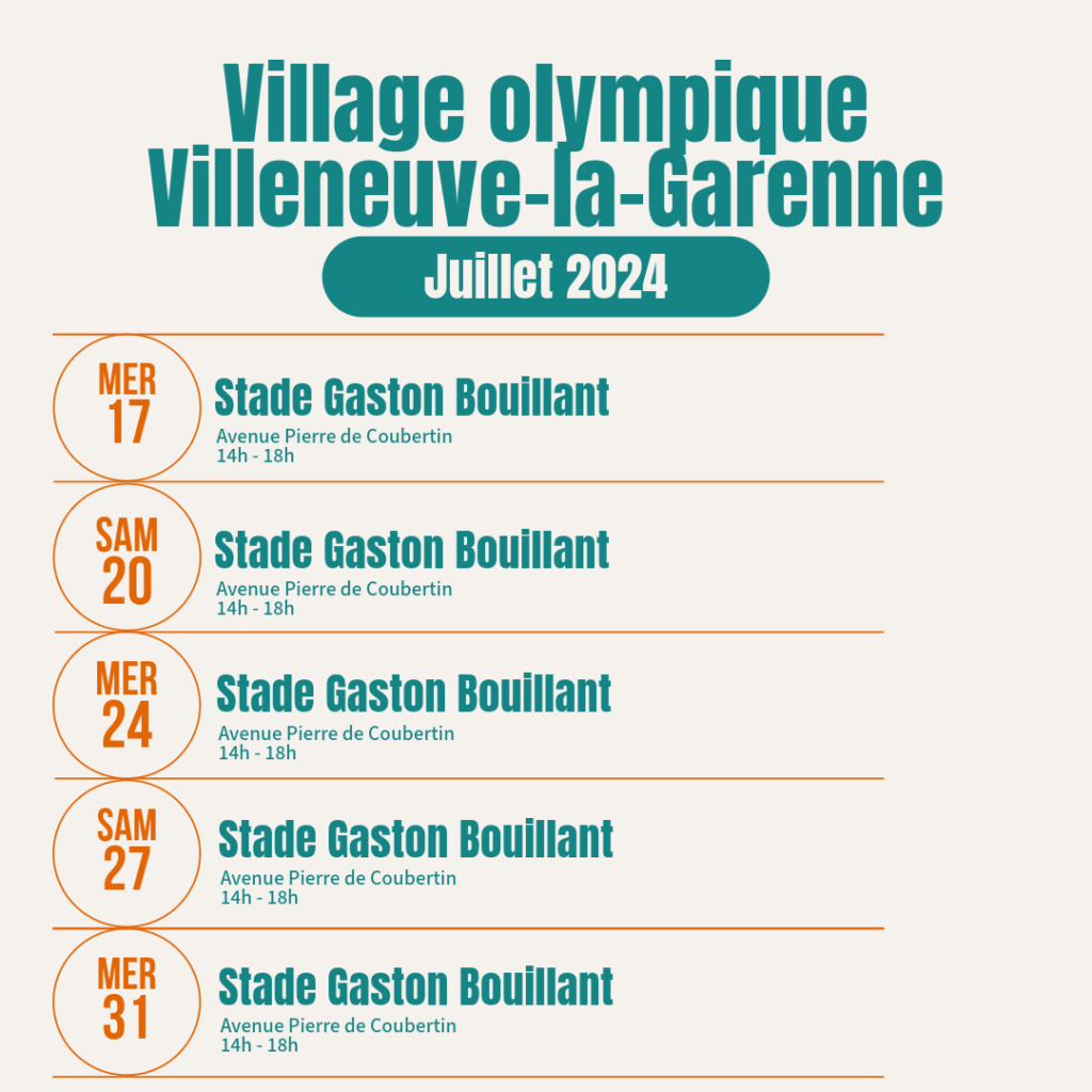 La prévention au village olympique Évènement de Villeneuve-la-Garenne 🗓️ juillet 2024 Les rendez-vous Prévention de l’étéVillage Olympique de Villeneuve-la Garenne Pour les Jeux Olympiques 2024 , la ville de Villeneuve-la-Garenne prévoit au Stade Gaston-Bouillant des activités inédites pour les mois de juillet et d’août.Un village culturel, sportif et fait pour se rencontrer ! Au programme avec […]