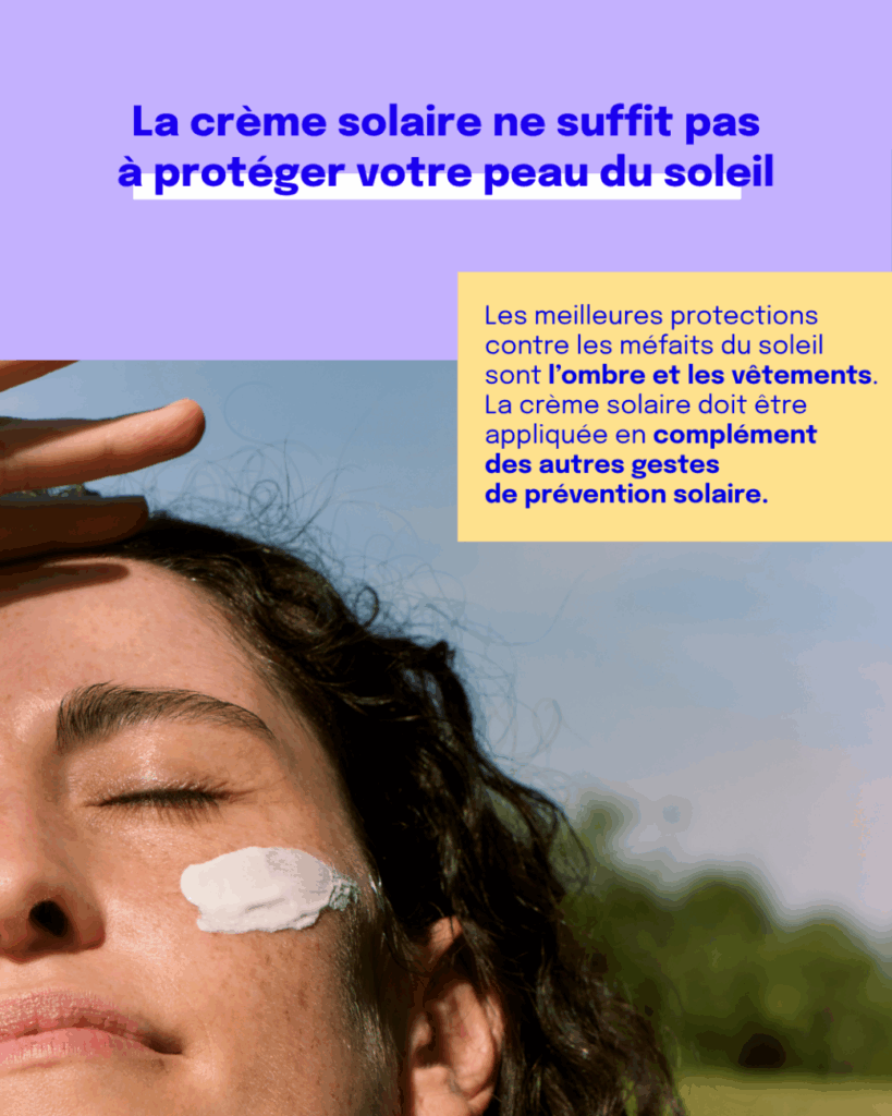 - En complément, appliquez régulièrement de la crème solaire avec un indice de protection élevé (minimum SPF 30). Il est crucial de renouveler l’application de la crème toutes les 2 heures et après la baignade ou toute activité qui provoque la transpiration.